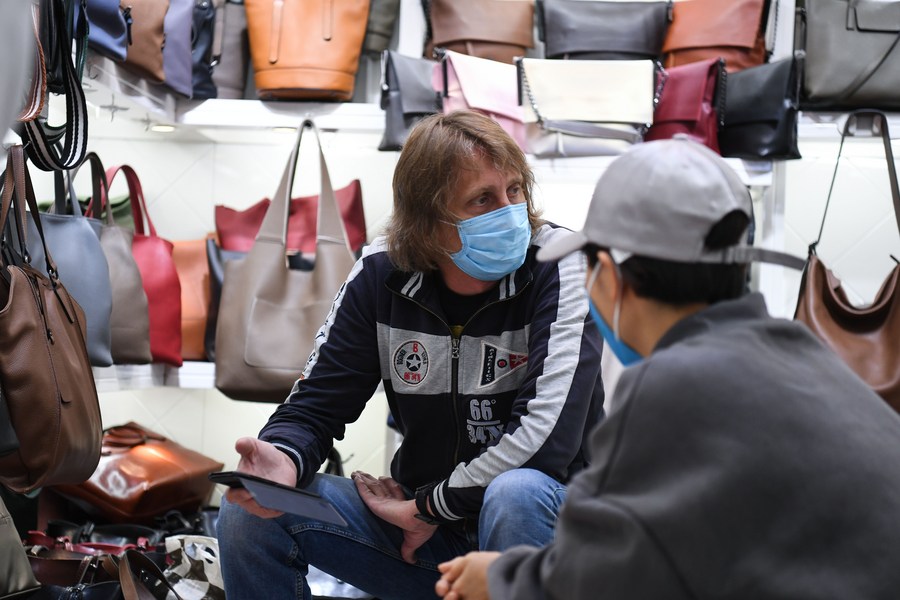 A foreign purchaser discusses business with a merchant at a leather goods market in Guangzhou, south China's Guangdong Province, March 5, 2020. (Xinhua/Deng Hua)
