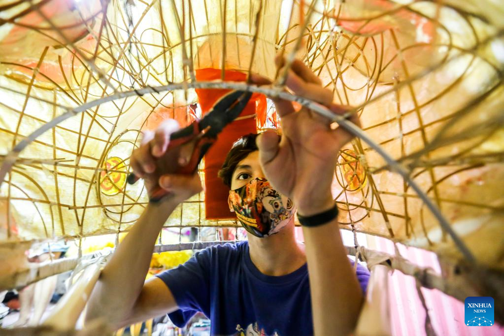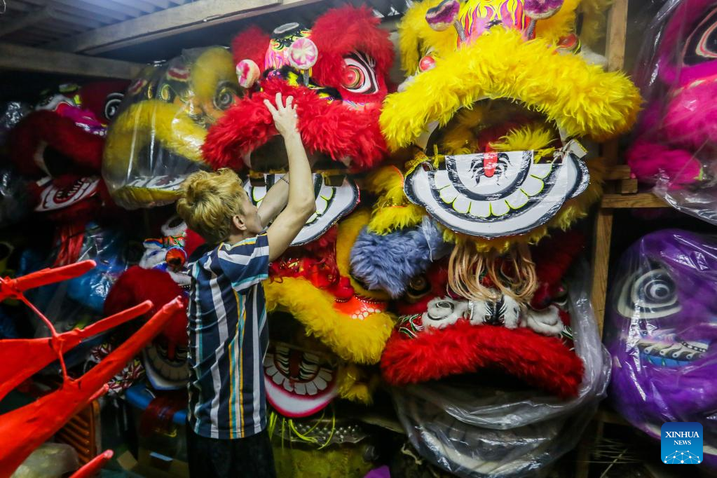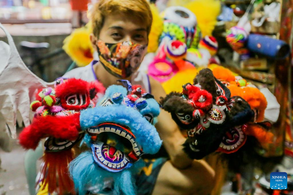 A member of a costume workshop works on a lion head costume in Manila, the Philippines, Jan. 24, 2022. Although most of performances for the upcoming Chinese lunar New Year celebrations are canceled in Manila due to epidemic prevention and control measures, local dragon and lion costume workshops still work on creations for customers who are ready to buy or rent the costumes to display. (Xinhua/Rouelle Umali)