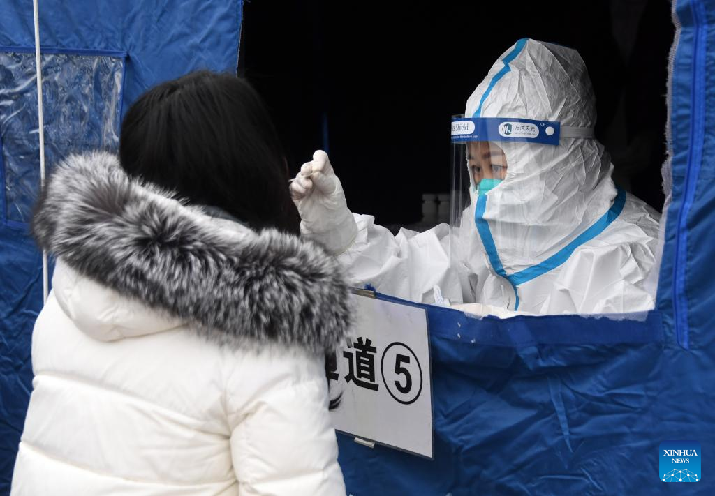 A medical worker takes a swab sample from a resident at a COVID-19 testing site in Haidian District in Beijing, capital of China, Jan. 24, 2022. (Xinhua/Ren Chao)
