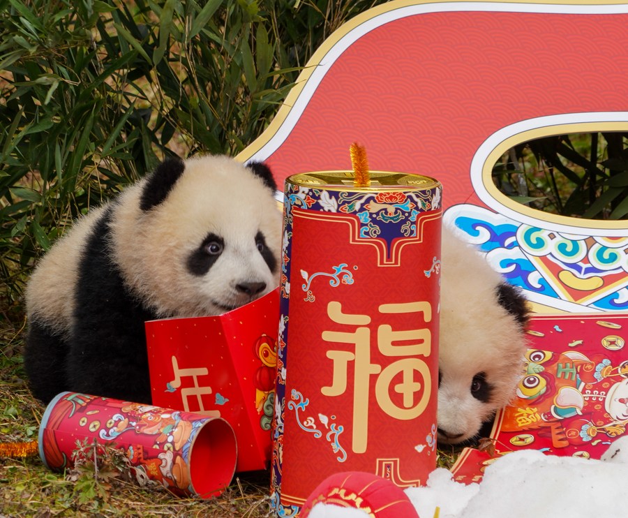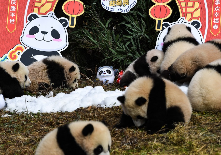 Photo taken on Jan. 24, 2022 shows giant panda cubs during a group appearance event at the Shenshuping base of China Conservation and Research Center for Giant Panda in Wolong, southwest China's Sichuan Province. (Xinhua/Wang Xi)