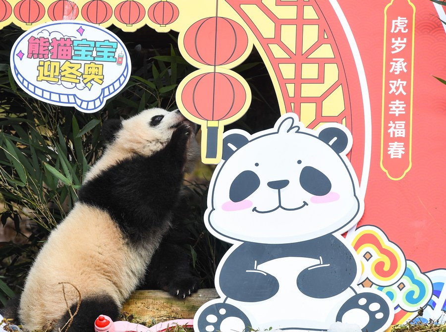 Photo taken on Jan. 24, 2022 shows a giant panda cub during a group appearance event at the Shenshuping base of China Conservation and Research Center for Giant Panda in Wolong, southwest China's Sichuan Province. (Xinhua/Wang Xi)