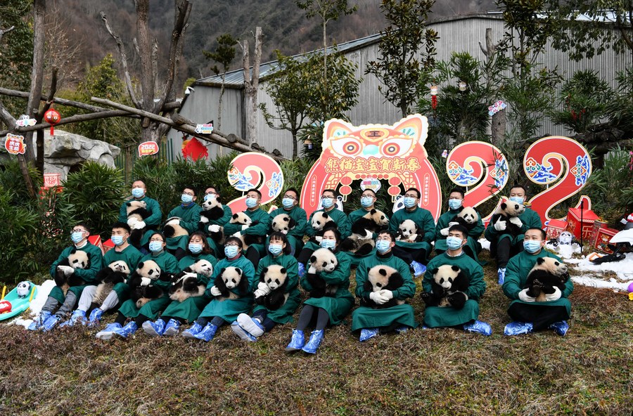 Staff members hold giant panda cubs during a group appearance event at the Shenshuping base of the China Conservation and Research Center for Giant Panda in Wolong, southwest China's Sichuan Province, Jan. 24, 2022. (Xinhua/Wang Xi)