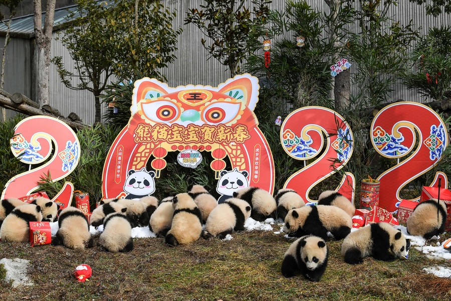 Photo taken on Jan. 24, 2022 shows giant panda cubs during a group appearance event at the Shenshuping base of China Conservation and Research Center for Giant Panda in Wolong, southwest China's Sichuan Province. (Photo by Chen Juwei/Xinhua)