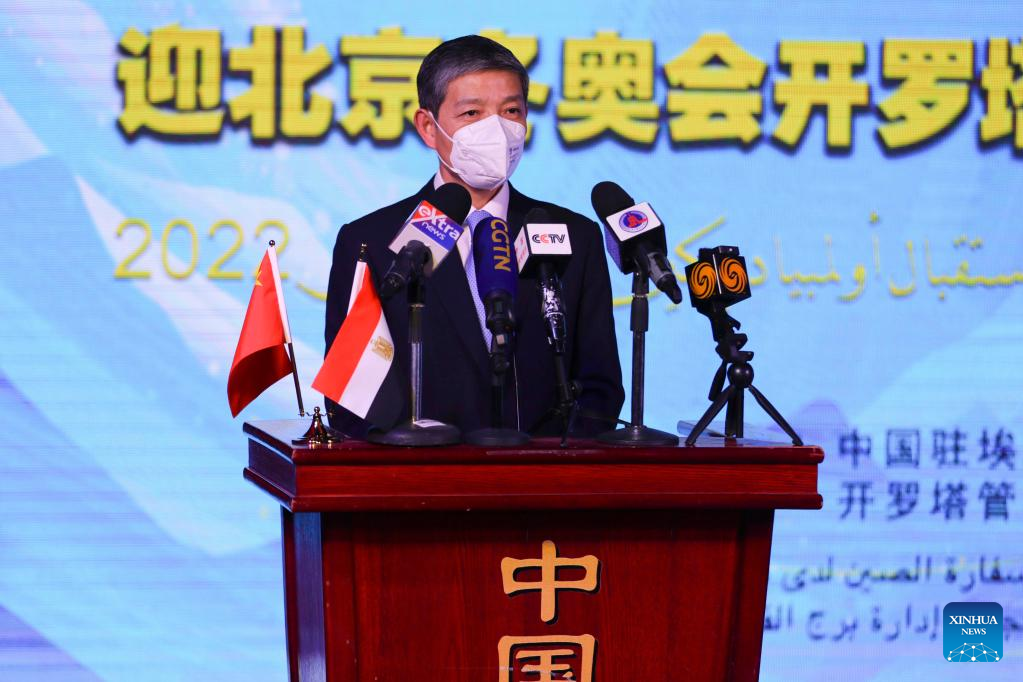 Chinese Ambassador to Egypt Liao Liqiang addresses the launching ceremony of a light show for Beijing 2022 Winter Olympics at the Cairo Tower in Cairo, Egypt, on Jan. 24, 2022. (Xinhua/Sui Xiankai)
