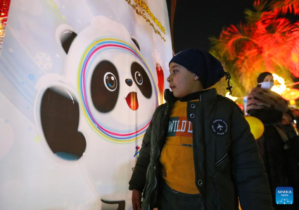 A child is seen during a light show in Cairo, Egypt, on Jan. 24, 2022. A light show was held at the Cairo Tower for the upcoming Beijing 2022 Winter Olympics. (Xinhua/Sui Xiankai)