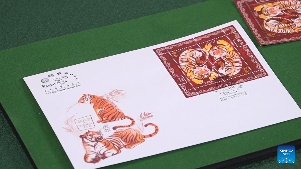 A first day cover with stamps for the Year of the Tiger is seen during the inauguration ceremony in Budapest, Hungary on Jan. 25, 2022. A special zodiac stamp issued by the Hungarian Post to celebrate the Chinese New Year of the Tiger was presented to the public in Hungary on Tuesday. (China Cultural Center in Budapest/Handout via Xinhua)