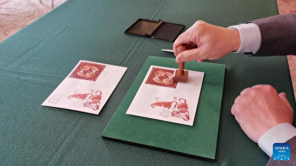 First day covers with stamps for the Year of the Tiger are seen during the inauguration ceremony in Budapest, Hungary on Jan. 25, 2022. A special zodiac stamp issued by the Hungarian Post to celebrate the Chinese New Year of the Tiger was presented to the public in Hungary on Tuesday. (China Cultural Center in Budapest/Handout via Xinhua)
