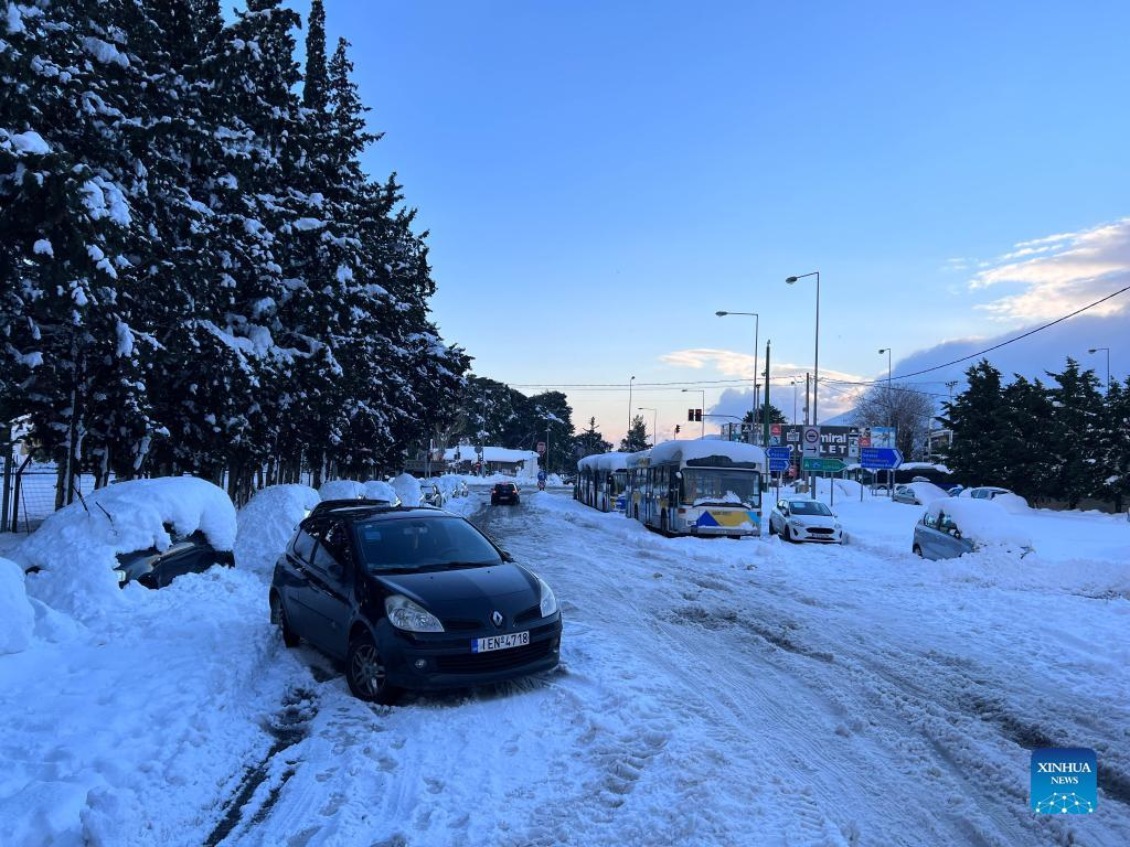 Vehicles are stranded in the northern suburb of Athens, Greece, on Jan. 25, 2022. Much of Greece was paralyzed on Tuesday for a second day after heavy snowfall caused hours of travel disruptions and power cuts. (Xinhua/Yu Shuaishuai)