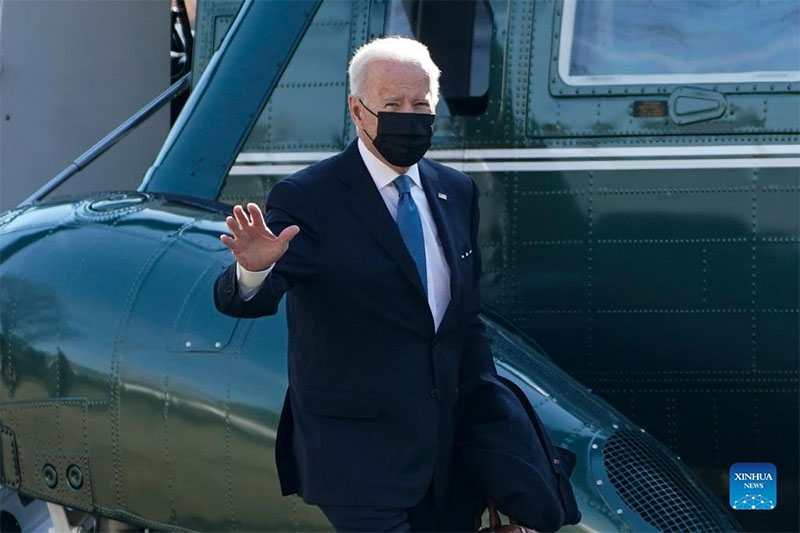 U.S. President Joe Biden arrives at the White House in Washington, D.C., the United States on Jan. 24, 2022. U.S. President Joe Biden reiterated Tuesday that there is no intention in his administration or within the North Atlantic Treaty Organization (NATO) to send troops into Ukraine, but that Russia will face serious economic consequences if it invades the former Soviet republic. (Photo by Ting Shen/Xinhua)
