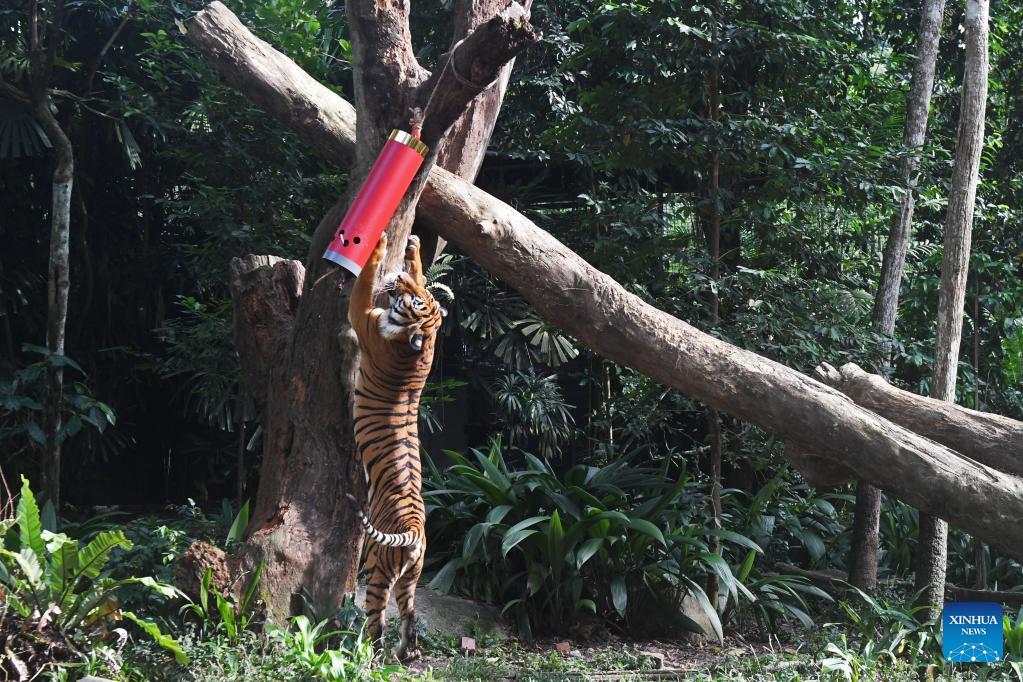 A Malayan tiger attempts to get to the food inside a firecracker-shaped container, as part of the Chinese Lunar New Year celebrations held in the Singapore Night Safari on Jan. 25, 2022. (Photo by Then Chih Wey/Xinhua)
