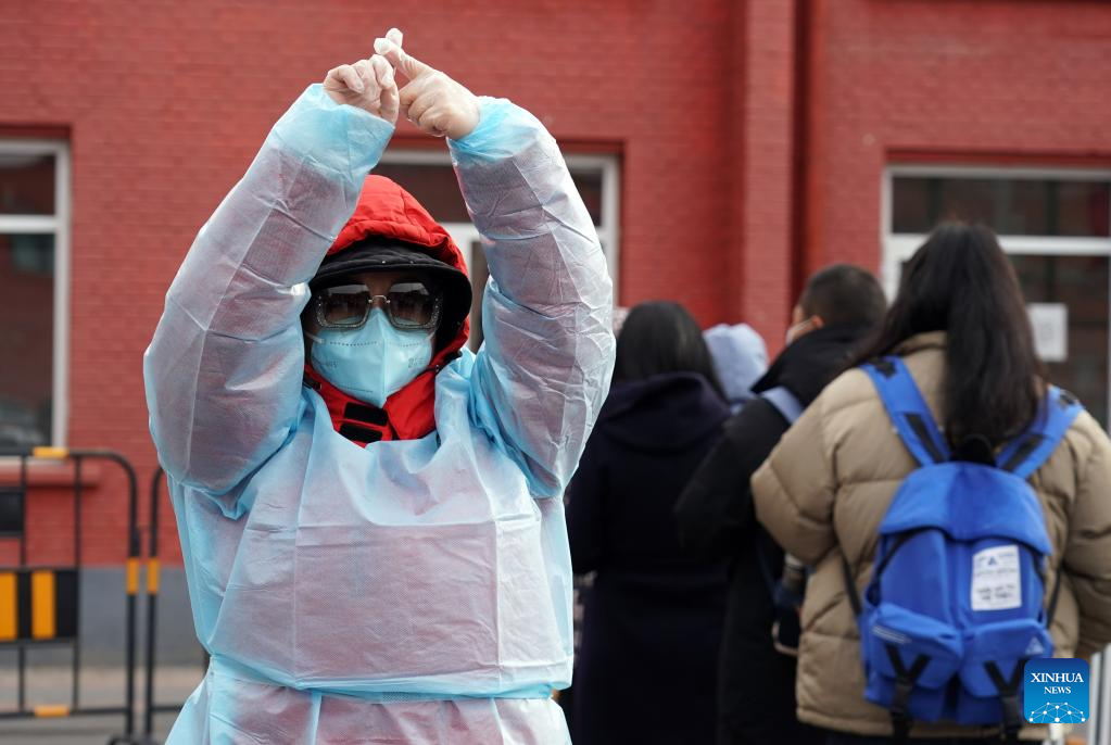 A staff member gestures to maintain order at a COVID-19 testing site in Xicheng District in Beijing, capital of China, Jan. 26, 2022. (Xinhua/Ren Chao)