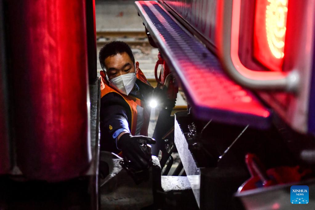 Li Ke checks the connection of train carriages in Taiyuan, north China's Shanxi Province, on Jan. 25, 2022. Li Taihong, 54, and his son Li Ke are both train drivers of China Railway Taiyuan Bureau Group Co., Ltd. Working in different positions, they spend more time apart than together, especially during the Spring Festival travel rush.