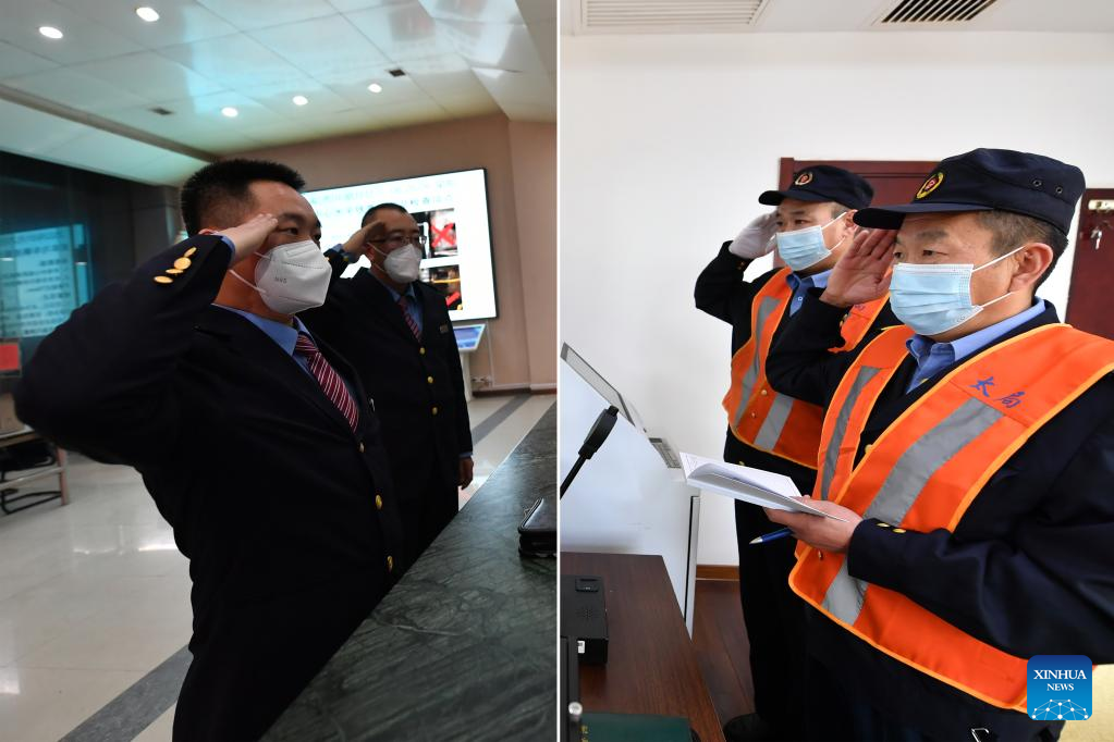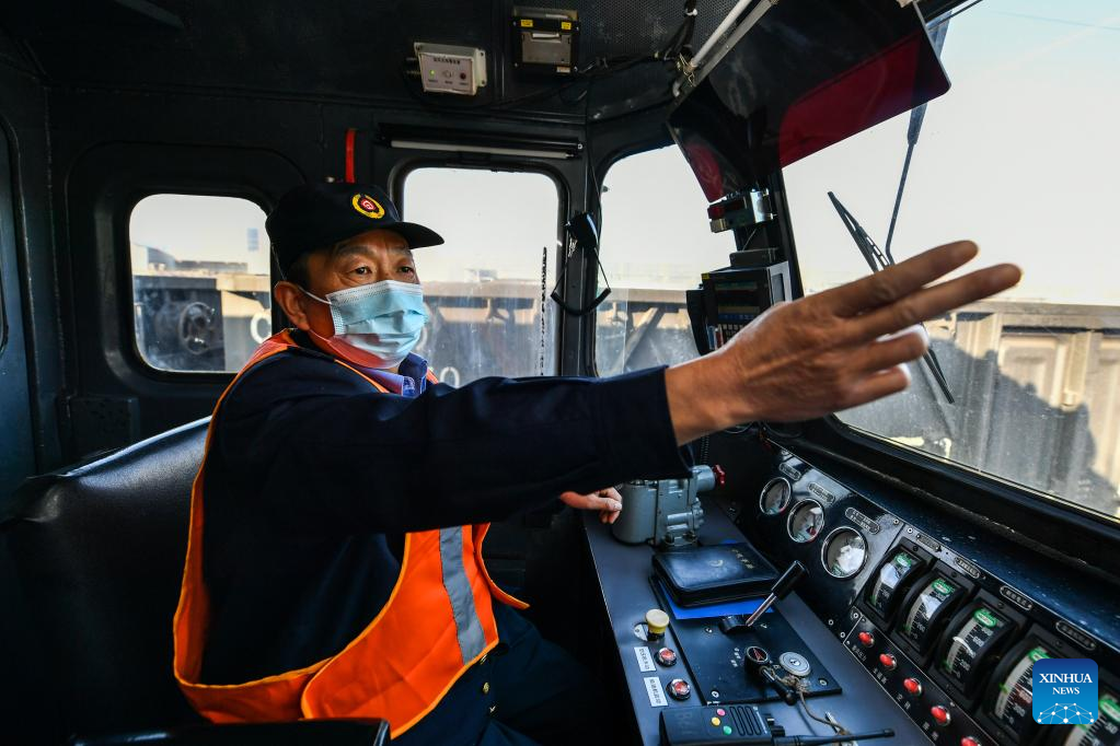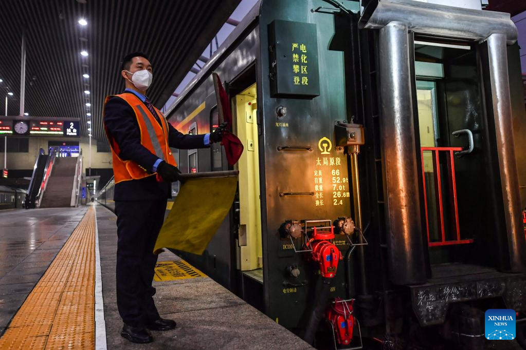 Li Taihong prepares for a train to depart in Taiyuan, north China's Shanxi Province, on Jan. 25, 2022. Li Taihong, 54, and his son Li Ke are both train drivers of China Railway Taiyuan Bureau Group Co., Ltd. Working in different positions, they spend more time apart than together, especially during the Spring Festival travel rush.