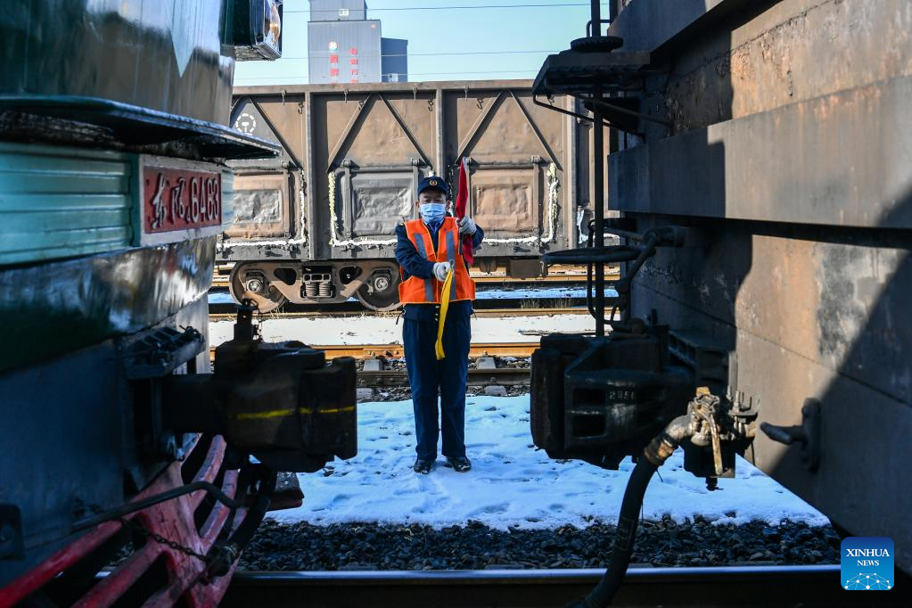 Li Ke uses signal flags to direct the train in Taiyuan, north China's Shanxi Province, on Jan. 25, 2022. Li Taihong, 54, and his son Li Ke are both train drivers of China Railway Taiyuan Bureau Group Co., Ltd. Working in different positions, they spend more time apart than together, especially during the Spring Festival travel rush.
