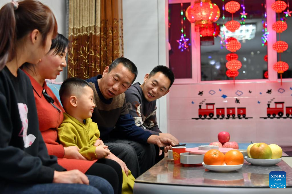 Li Taihong talks with his family members in Taiyuan, north China's Shanxi Province, on Jan. 25, 2022. Li Taihong, 54, and his son Li Ke are both train drivers of China Railway Taiyuan Bureau Group Co., Ltd. Working in different positions, they spend more time apart than together, especially during the Spring Festival travel rush.