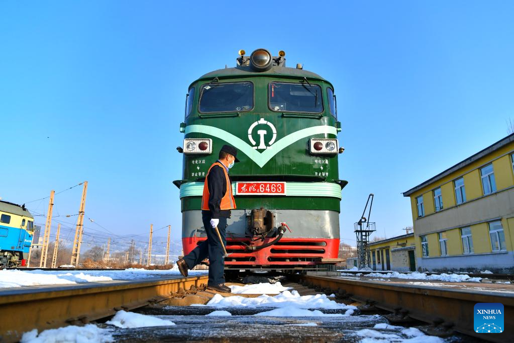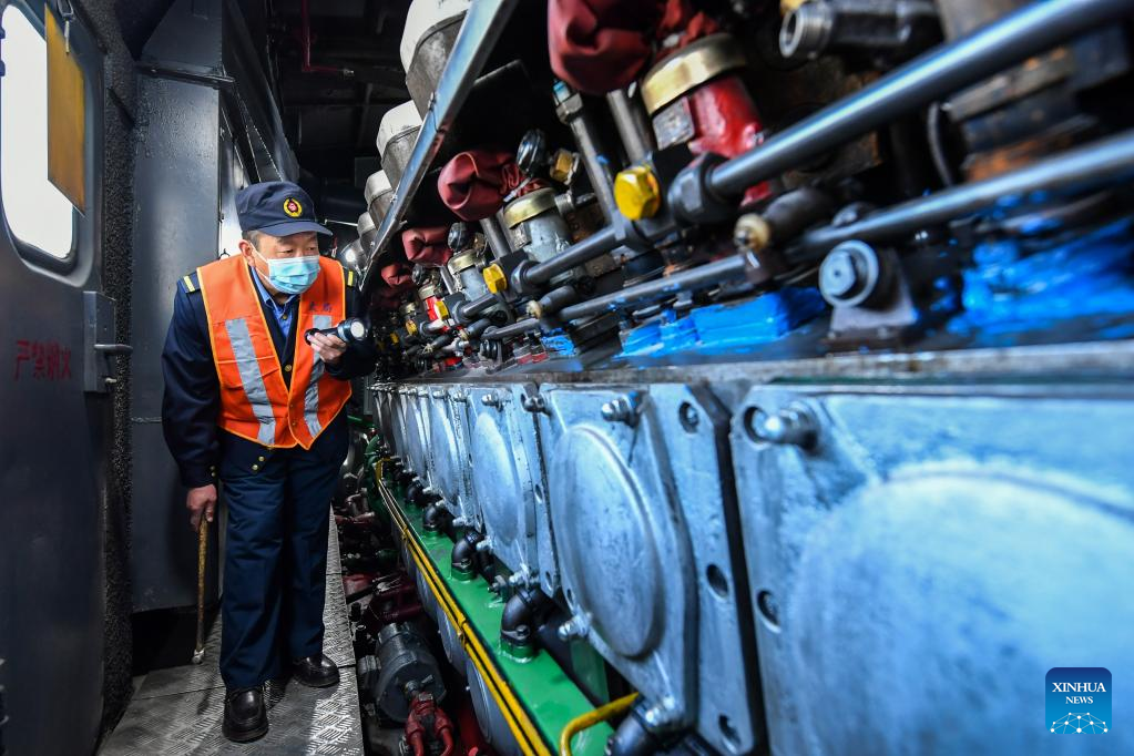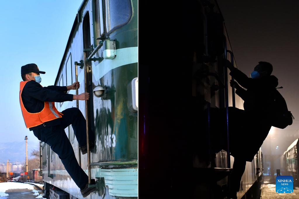 Li Taihong checks the train before departure in Taiyuan, north China's Shanxi Province, on Jan. 25, 2022. Li Taihong, 54, and his son Li Ke are both train drivers of China Railway Taiyuan Bureau Group Co., Ltd. Working in different positions, they spend more time apart than together, especially during the Spring Festival travel rush.