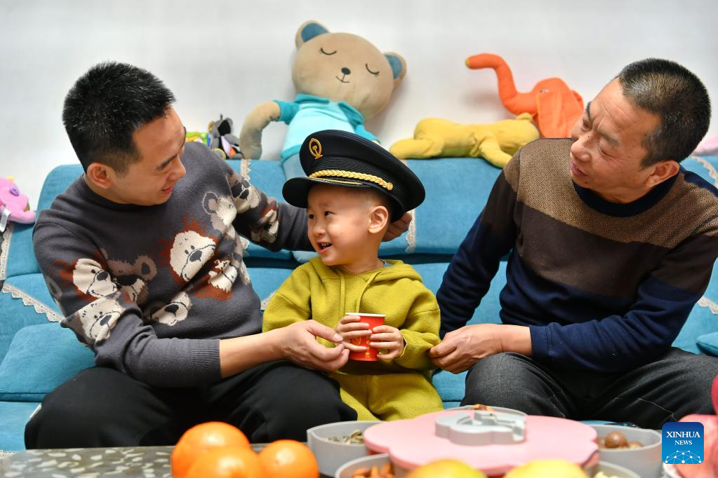 Li Taihong talks with his son and grandson in Taiyuan, north China's Shanxi Province, on Jan. 25, 2022. Li Taihong, 54, and his son Li Ke are both train drivers of China Railway Taiyuan Bureau Group Co., Ltd. Working in different positions, they spend more time apart than together, especially during the Spring Festival travel rush.