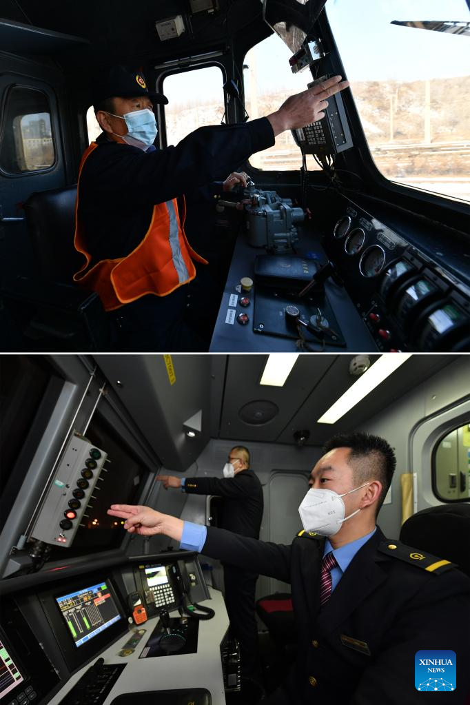 Combo photo shows Li Taihong (top) and Li Ke (R, bottom) working at the driving cabin of trains in Taiyuan, north China's Shanxi Province, on Jan. 25, 2022. Li Taihong, 54, and his son Li Ke are both train drivers of China Railway Taiyuan Bureau Group Co., Ltd. Working in different positions, they spend more time apart than together, especially during the Spring Festival travel rush.