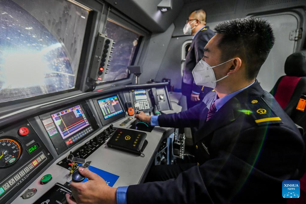 Li Taihong works at the driving cabin of a train in Taiyuan, north China's Shanxi Province, on Jan. 25, 2022. Li Taihong, 54, and his son Li Ke are both train drivers of China Railway Taiyuan Bureau Group Co., Ltd. Working in different positions, they spend more time apart than together, especially during the Spring Festival travel rush.