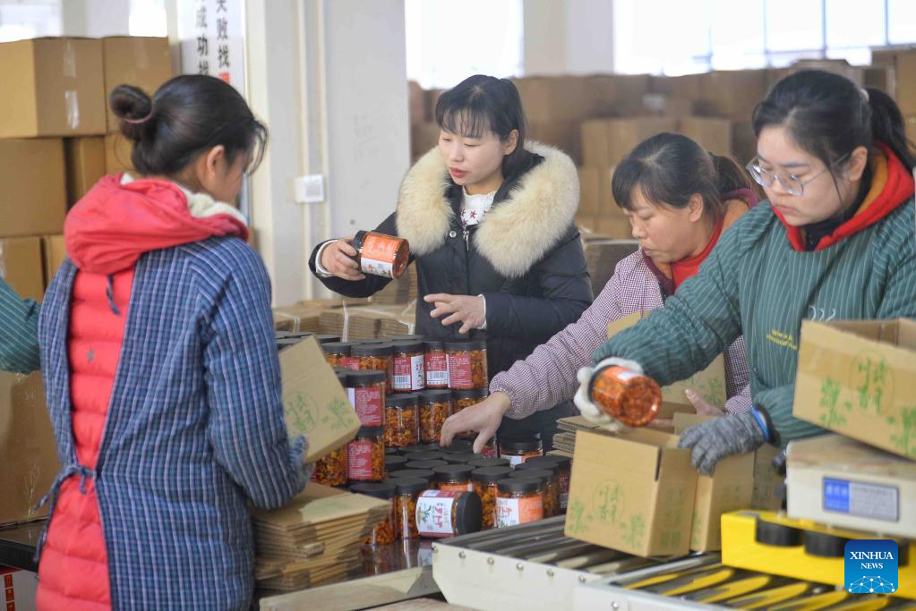 Wu Qiuyue (2nd L) packs dried radish with workers in Zhuhai Village of Baijie Town of Naxi District, Luzhou, southwest China's Sichuan Province, Jan. 18, 2022. Years ago, Wu Qiuyue used to work in an electronics factory in south China's Shenzhen. Later, in order to take care of her parents and daughter, she and her husband Huang Zhongping decided to return to her hometown to start a business together. (Xinhua/Liu Kun)