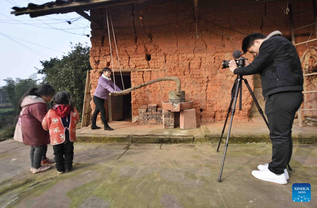 Wu Qiuyue's younger brother shoots a video of her grinding tofu at a yard in Zhuhai Village of Baijie Town of Naxi District, Luzhou, southwest China's Sichuan Province, Jan. 18, 2022. Years ago, Wu Qiuyue used to work in an electronics factory in south China's Shenzhen. Later, in order to take care of her parents and daughter, she and her husband Huang Zhongping decided to return to her hometown to start a business together. (Xinhua/Liu Kun)