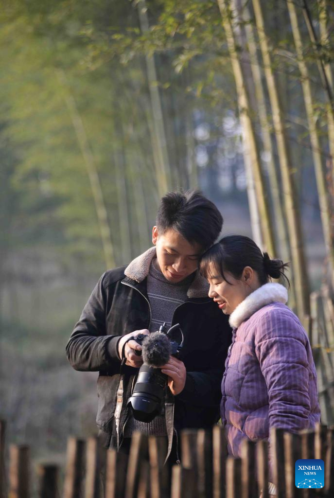 Wu Qiuyue and her family shoot a short video about their daily life in Zhuhai Village of Baijie Town of Naxi District, Luzhou, southwest China's Sichuan Province, Jan. 18, 2022. Years ago, Wu Qiuyue used to work in an electronics factory in south China's Shenzhen. Later, in order to take care of her parents and daughter, she and her husband Huang Zhongping decided to return to her hometown to start a business together. (Xinhua/Liu Kun)
