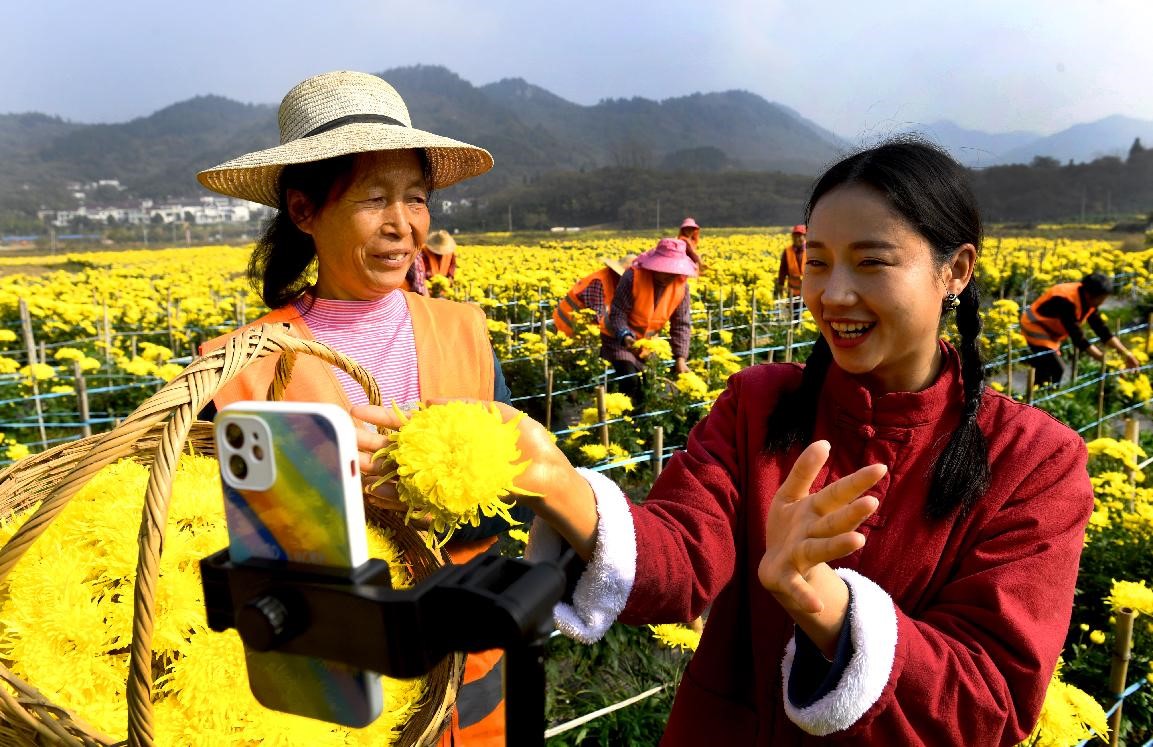 A livestreaming host livestreams farmers picking gold emperor chrysanthemum in Wenchong village, Shucheng county, Lu’an city, east China’s Anhui province, Nov. 3, 2021. (People’s Daily Online/ Chen Li)