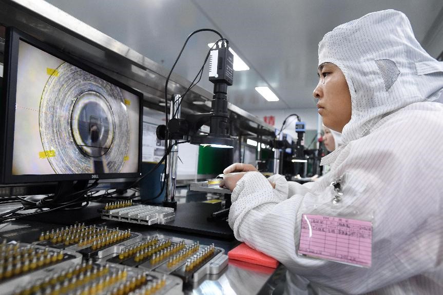 A worker with Jiangxi TFC Technology Co., Ltd. located in Gao’an city, east China’s Jiangxi province, tests precision components for optical network connection. The company’s optical waveguide products enjoy a global market share of more than 30 percent. (People’s Daily Online/ Zhou Liang)