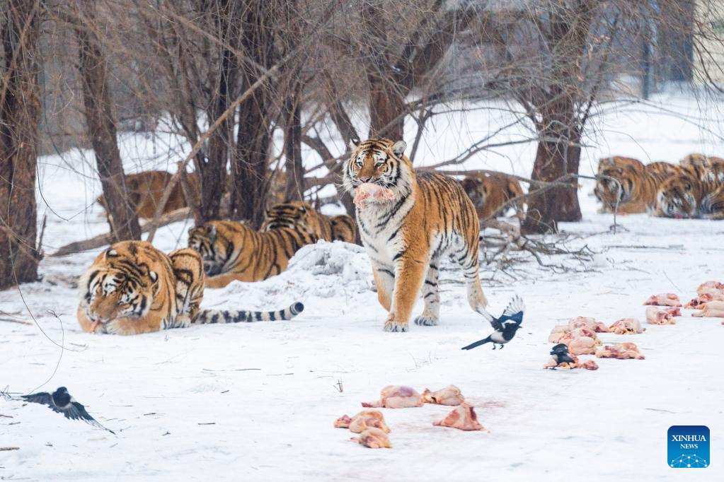 Photo taken on Jan. 25, 2022 shows Siberian tigers eating at the Siberian Tiger Park in northeast China's Heilongjiang Province. (Xinhua/Xie Jianfei)