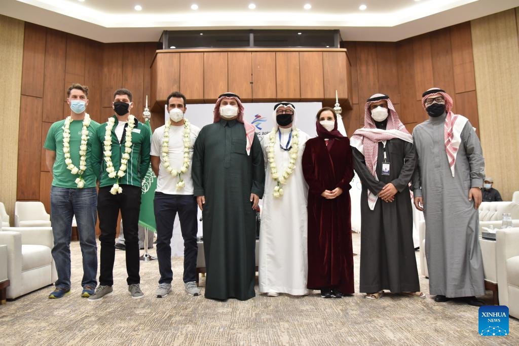 Fahad Bin Jalawi (4th L), vice-president of Saudi Olympic &Paralympic Committee, poses for pictures with athletes, coaches and the staff of the Saudi Winter Sports Federation during a press conference in Riyadh, Saudi Arabia, Jan. 26, 2022. Saudi Arabia will send a 9-member delegation to Beijing 2022 Olympic Winter Games. (Xinhua/Wang Haizhou)