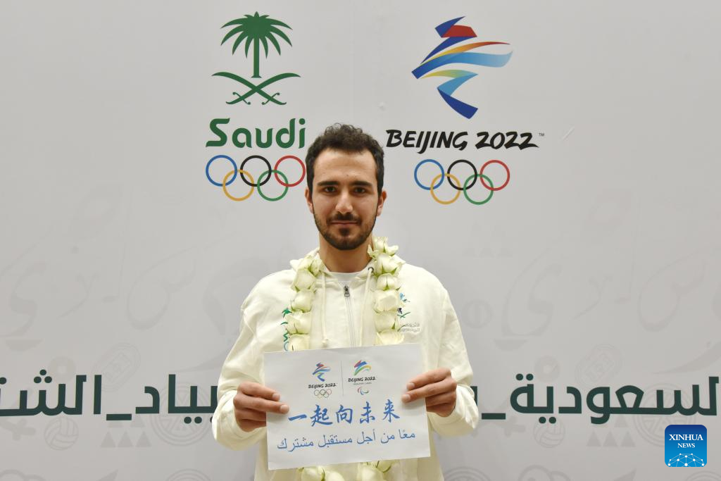 Saudi Alpine skier Fayik Abdi poses with a piece of paper printing "Together for a Shared Future", the official motto for Beijing 2022, after a press conference in Riyadh, Saudi Arabia, Jan. 26, 2022. Saudi Arabia will send a 9-member delegation to Beijing 2022 Olympic Winter Games. (Xinhua/Wang Haizhou)