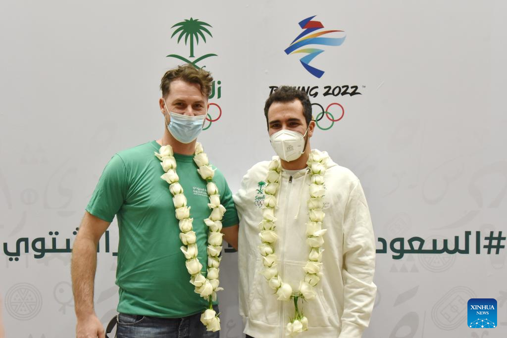 Saudi Alpine skier Fayik Abdi (R) poses with his coach after a press conference in Riyadh, Saudi Arabia, Jan. 26, 2022. Saudi Arabia will send a 9-member delegation to Beijing 2022 Olympic Winter Games. (Xinhua/Wang Haizhou)