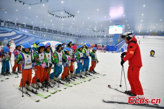 Children ski under the guidance of an instructor at the Sunac Snow Park in Kunming, southwest China's Yunnan Province, Jan. 26, 2022. (Photo: China News Service/Liu Yanyang)