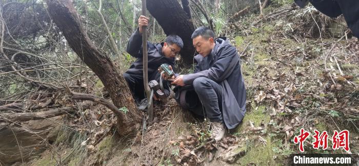 Photo shows two forest rangers checking the footage captured by an infrared camera. (Photo/Yang Yong)