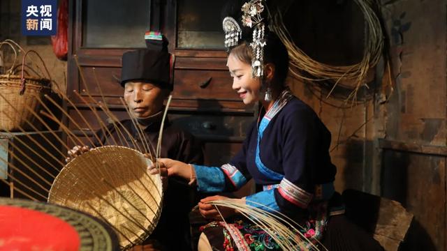 Zhang Guodan weaves a basket with a villager. (Photo/CCTV News)
