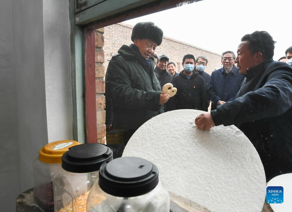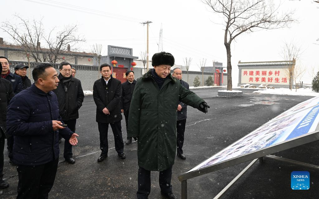 Chinese President Xi Jinping, also general secretary of the Communist Party of China (CPC) Central Committee and chairman of the Central Military Commission, inspects local work in consolidating and expanding anti-poverty achievements and advancing rural vitalization in Duancun Village, Sengnian Township of Fenxi County, north China's Shanxi Province, Jan. 26, 2022. Xi on Wednesday began his visit to Shanxi Province ahead of the Spring Festival, or the Chinese New Year. (Xinhua/Li Xueren)