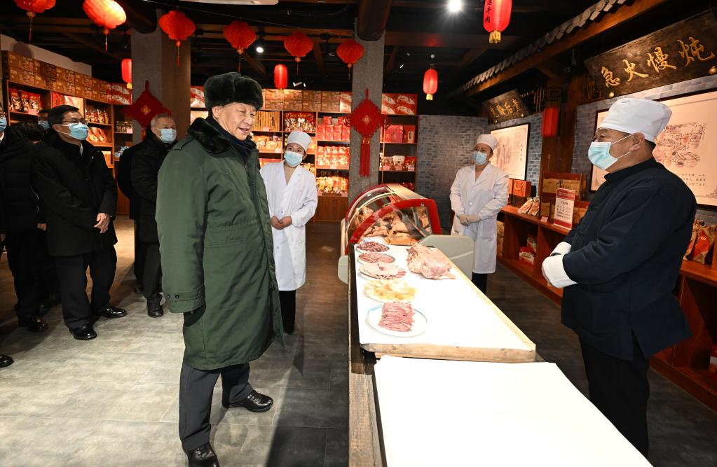 Chinese President Xi Jinping, also general secretary of the Communist Party of China (CPC) Central Committee and chairman of the Central Military Commission, visits a shop selling cooked beef in Pingyao, north China's Shanxi Province, Jan. 27, 2022. Xi extended Spring Festival greetings to all Chinese people during his visit to Shanxi Province from Wednesday to Thursday. (Xinhua/Li Xueren)