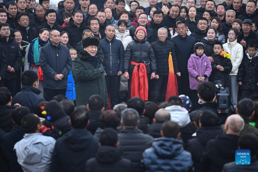 Chinese President Xi Jinping, also general secretary of the Communist Party of China (CPC) Central Committee and chairman of the Central Military Commission, wishes Chinese people of all ethnic groups, compatriots in Hong Kong, Macao and Taiwan, and overseas Chinese healthier and happier lives in the Year of the Tiger, in front of villagers at a local square in Duancun Village, Sengnian Township of Fenxi County, north China's Shanxi Province, Jan. 26, 2022. Xi extended Spring Festival greetings to all Chinese people during his visit to Shanxi Province from Wednesday to Thursday. (Xinhua/Li Xueren)