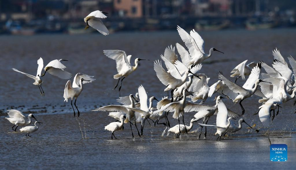 A flock of black-faced spoonbills and other birds are seen at a wetland park in south China's Hainan Province, Jan. 27, 2022. (Xinhua/Yang Guanyu)
