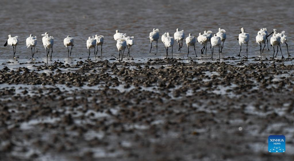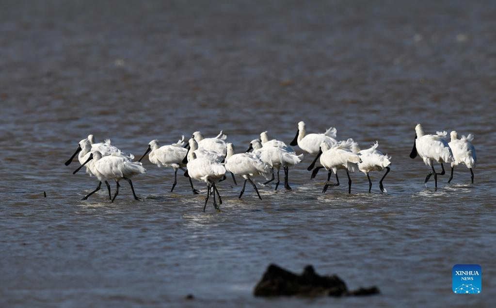 A flock of black-faced spoonbills forage at a wetland park in south China's Hainan Province, Jan. 27, 2022. (Xinhua/Yang Guanyu)