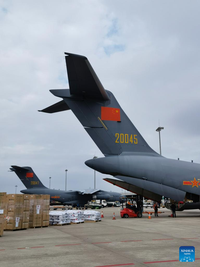 Photo taken with a mobile phone shows disaster relief materials loaded onto two Chinese air force transport aircrafts to head for Tonga at the Guangzhou Baiyun International Airport in Guangzhou, south China's Guangdong Province, Jan. 26, 2022. (Xinhua/Ding Zengyi)