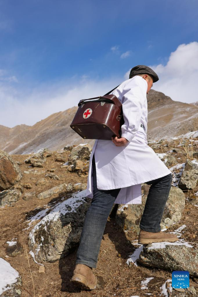 A veterinarian makes a round of visits in Akyaz Valley in Zhaosu County, Kazak Autonomous Prefecture of Ili, northwest China's Xinjiang Uygur Autonomous Region, Jan. 25, 2022. Akyaz Valley is an important winter pasture for herdsmen in Zhaosu. Every year, herdsmen would migrate along the Akyaz River, driving over 500,000 cattle with them to settle in the valley for the winter. With an average altitude of 3,000 meters, the Akyaz Valley has abundant grass, water and a warmer climate, thanks to the surrounding mountains which block the cold winds. In recent years, while protecting the nomadic tradition, the local government has tried to improve the living conditions in the valley by upgrading the roads, building new communication facilities, installing photovoltaic generators for herdsmen's houses, and constructing animal husbandry hospitals. (Xinhua/Zhao Ge)
