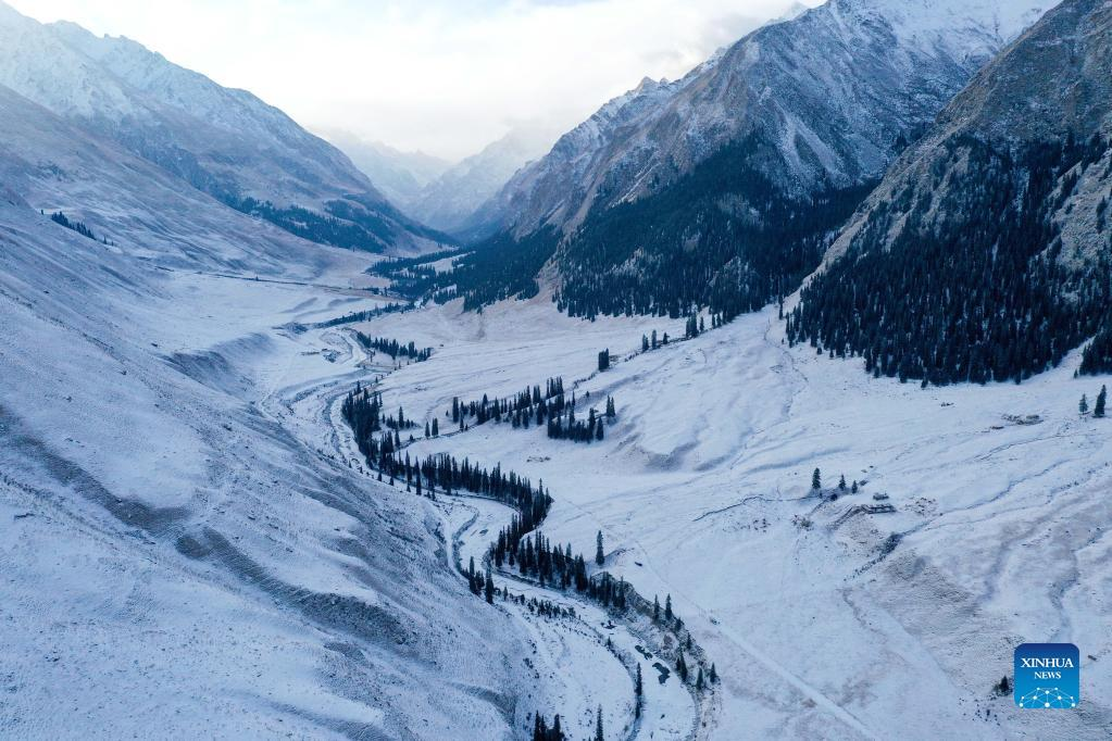 Aerial photo taken on Jan. 25, 2022 shows the Akyaz Valley in Zhaosu County, Kazak Autonomous Prefecture of Ili, northwest China's Xinjiang Uygur Autonomous Region. Akyaz Valley is an important winter pasture for herdsmen in Zhaosu. Every year, herdsmen would migrate along the Akyaz River, driving over 500,000 cattle with them to settle in the valley for the winter. With an average altitude of 3,000 meters, the Akyaz Valley has abundant grass, water and a warmer climate, thanks to the surrounding mountains which block the cold winds. In recent years, while protecting the nomadic tradition, the local government has tried to improve the living conditions in the valley by upgrading the roads, building new communication facilities, installing photovoltaic generators for herdsmen's houses, and constructing animal husbandry hospitals. (Xinhua/Ding Lei)