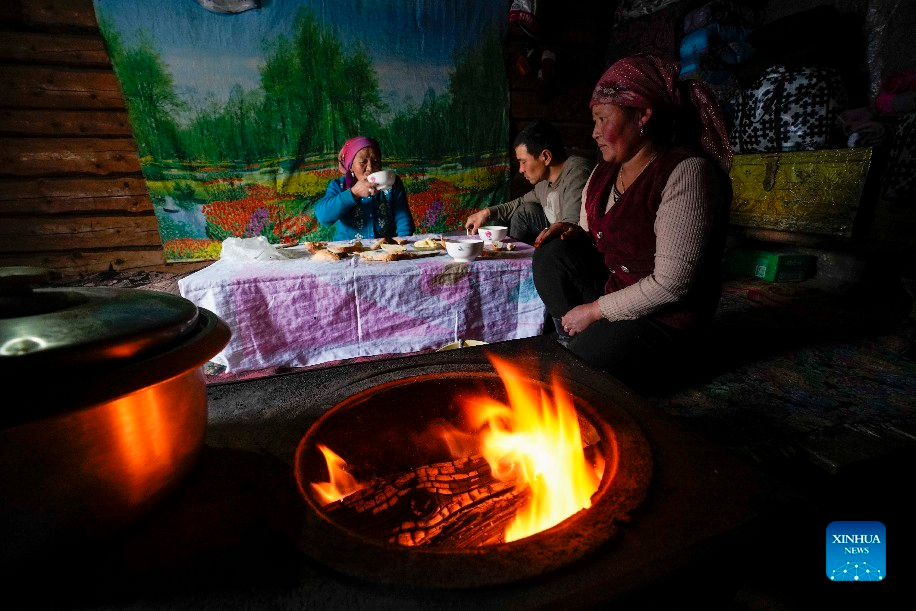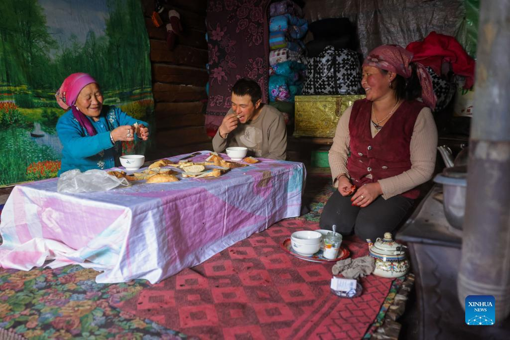 A herdsmen family have breakfast at home in Akyaz Valley in Zhaosu County, Kazak Autonomous Prefecture of Ili, northwest China's Xinjiang Uygur Autonomous Region, Jan. 25, 2022. Akyaz Valley is an important winter pasture for herdsmen in Zhaosu. Every year, herdsmen would migrate along the Akyaz River, driving over 500,000 cattle with them to settle in the valley for the winter. With an average altitude of 3,000 meters, the Akyaz Valley has abundant grass, water and a warmer climate, thanks to the surrounding mountains which block the cold winds. In recent years, while protecting the nomadic tradition, the local government has tried to improve the living conditions in the valley by upgrading the roads, building new communication facilities, installing photovoltaic generators for herdsmen's houses, and constructing animal husbandry hospitals. (Xinhua/Zhao Ge)
