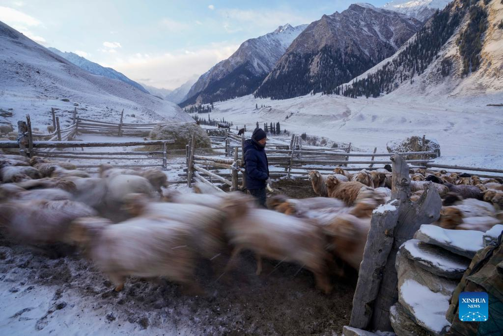 A herdsman herds sheep in Akyaz Valley in Zhaosu County, Kazak Autonomous Prefecture of Ili, northwest China's Xinjiang Uygur Autonomous Region, Jan. 25, 2022. Akyaz Valley is an important winter pasture for herdsmen in Zhaosu. Every year, herdsmen would migrate along the Akyaz River, driving over 500,000 cattle with them to settle in the valley for the winter. With an average altitude of 3,000 meters, the Akyaz Valley has abundant grass, water and a warmer climate, thanks to the surrounding mountains which block the cold winds. In recent years, while protecting the nomadic tradition, the local government has tried to improve the living conditions in the valley by upgrading the roads, building new communication facilities, installing photovoltaic generators for herdsmen's houses, and constructing animal husbandry hospitals. (Xinhua/Zhao Ge)