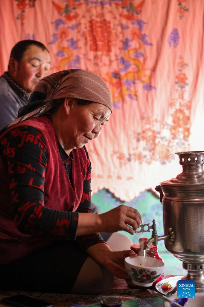 A woman makes tea at home in Akyaz Valley in Zhaosu County, Kazak Autonomous Prefecture of Ili, northwest China's Xinjiang Uygur Autonomous Region, Jan. 24, 2022. Akyaz Valley is an important winter pasture for herdsmen in Zhaosu. Every year, herdsmen would migrate along the Akyaz River, driving over 500,000 cattle with them to settle in the valley for the winter. With an average altitude of 3,000 meters, the Akyaz Valley has abundant grass, water and a warmer climate, thanks to the surrounding mountains which block the cold winds. In recent years, while protecting the nomadic tradition, the local government has tried to improve the living conditions in the valley by upgrading the roads, building new communication facilities, installing photovoltaic generators for herdsmen's houses, and constructing animal husbandry hospitals. (Xinhua/Ding Lei)