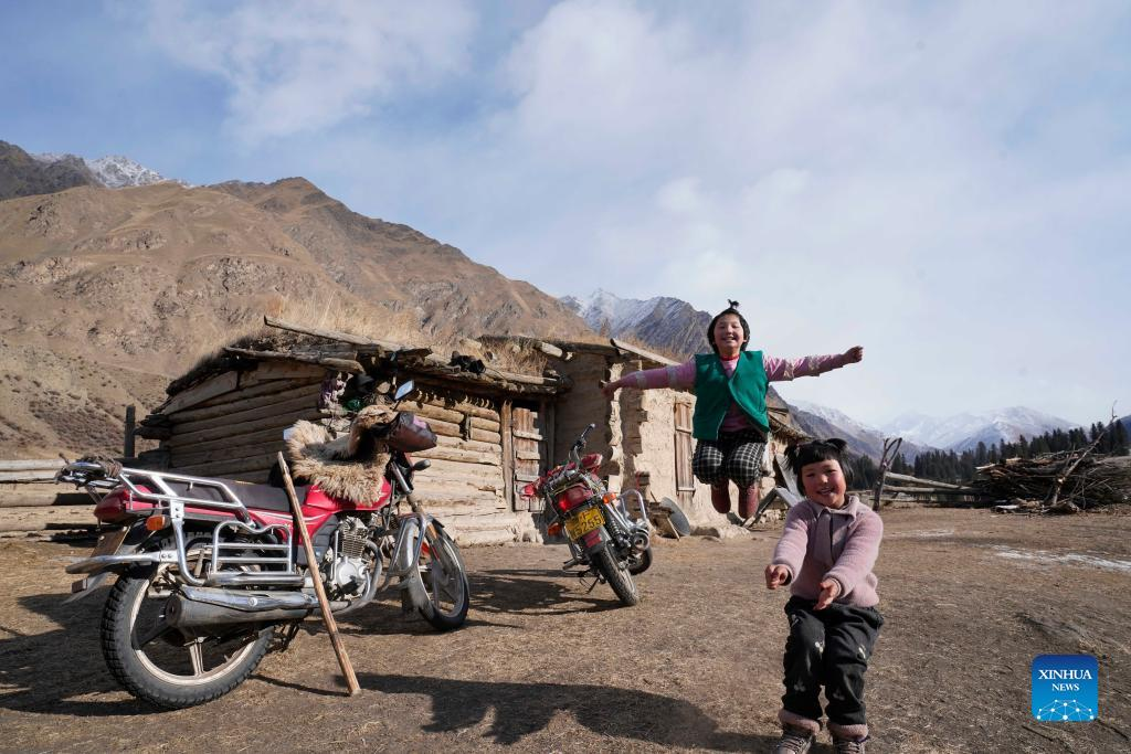 Children play at home in Akyaz Valley in Zhaosu County, Kazak Autonomous Prefecture of Ili, northwest China's Xinjiang Uygur Autonomous Region, Jan. 24, 2022. Akyaz Valley is an important winter pasture for herdsmen in Zhaosu. Every year, herdsmen would migrate along the Akyaz River, driving over 500,000 cattle with them to settle in the valley for the winter. With an average altitude of 3,000 meters, the Akyaz Valley has abundant grass, water and a warmer climate, thanks to the surrounding mountains which block the cold winds. In recent years, while protecting the nomadic tradition, the local government has tried to improve the living conditions in the valley by upgrading the roads, building new communication facilities, installing photovoltaic generators for herdsmen's houses, and constructing animal husbandry hospitals. (Xinhua/Ding Lei)