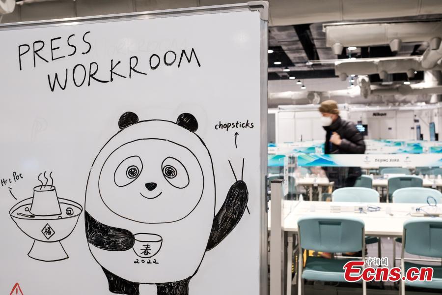 Volunteers paint Olympic elements at the Main Media Center for the 2022 Olympic and Paralympic Winter Games in Beijing, capital of China, Jan.26, 2022. (Photo: China News Service/He Penglei)