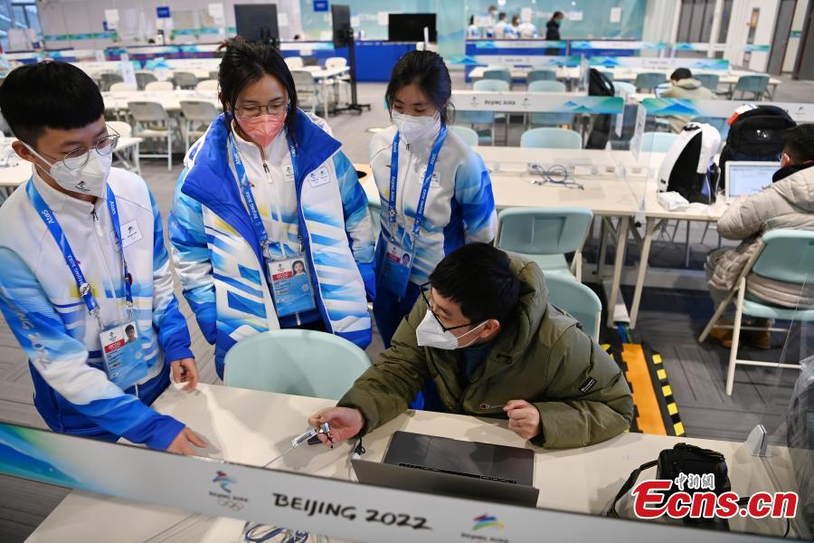 Volunteers introduce media facilities to reporters at the Main Media Center for the 2022 Olympic and Paralympic Winter Games in Beijing, capital of China. (Photo: China News Service/Mao Jianjun)