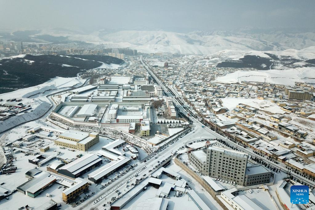 Aerial photo taken on Jan. 28, 2022 shows a view of the snow-covered Hezuo City in Gannan Tibetan Autonomous Prefecture, northwest China's Gansu Province. (Xinhua/Fan Peishen)